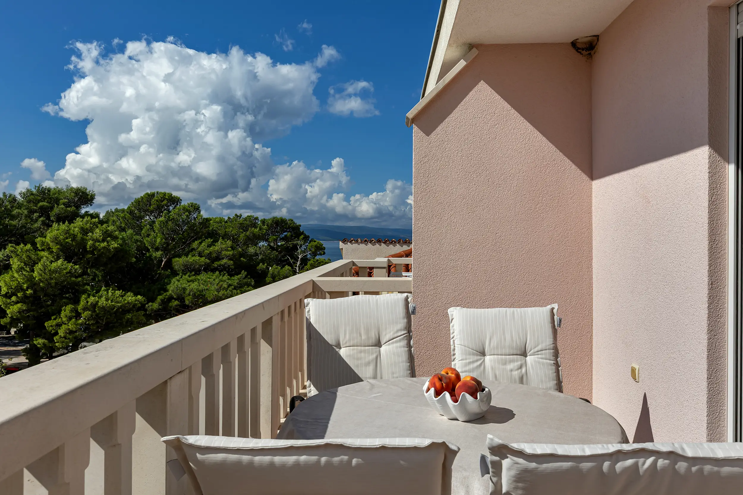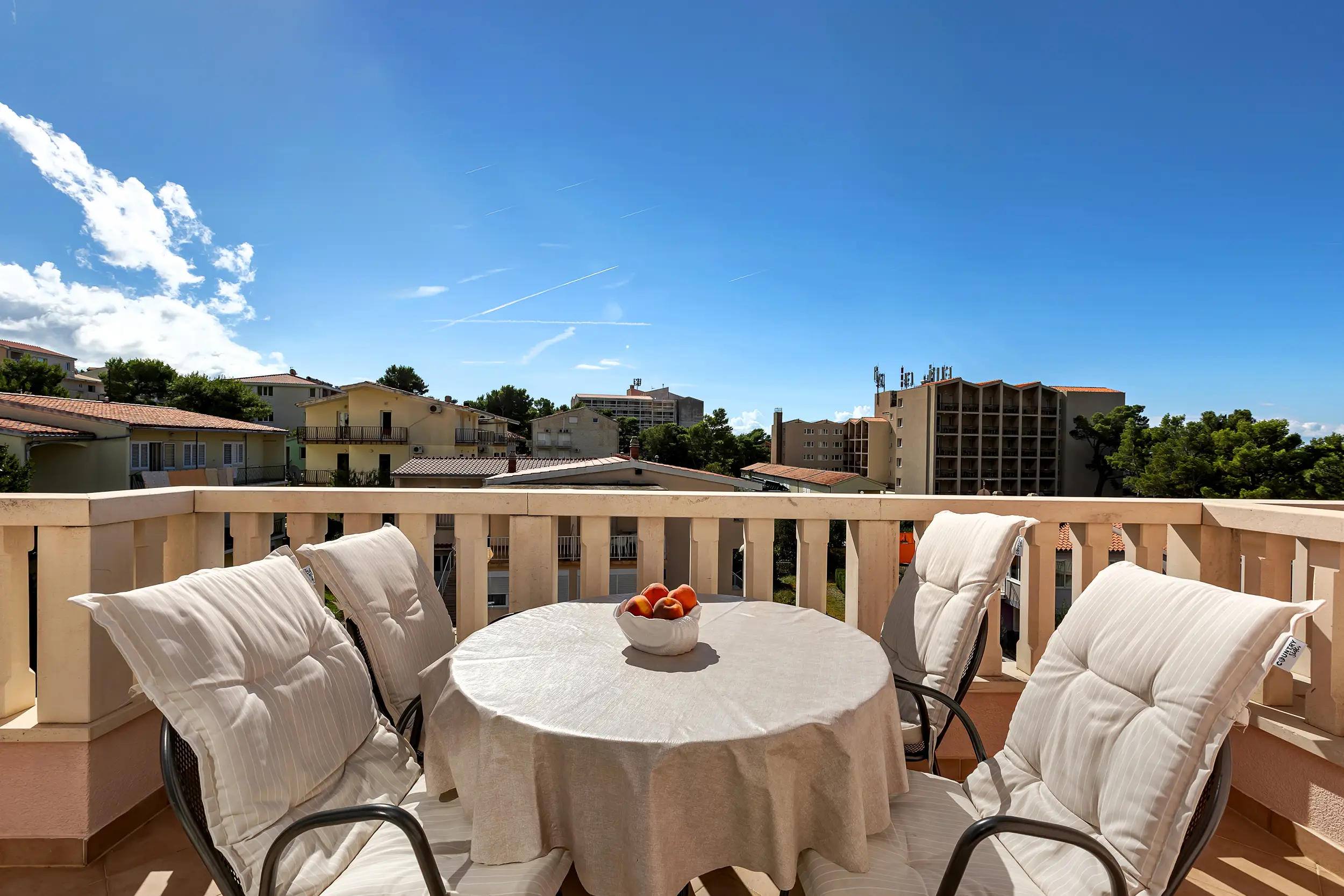 Iz dnevnog boravka izlazi se na prostrani balkon površine 9 m², idealan za opuštanje. Gostima su također dostupni bazen, roštilj u dvorištu objekta, fitness soba u podrumu te vlastita perilica rublja. Svaki apartman ima osigurano jedno parkirno mjesto, a nalazi se na samo 90 metara od poznate plaže Nikolina. Pogled na more. Roštilj i drveni vanjski stol i klupe, bazen, ležaljke i suncobrani.
