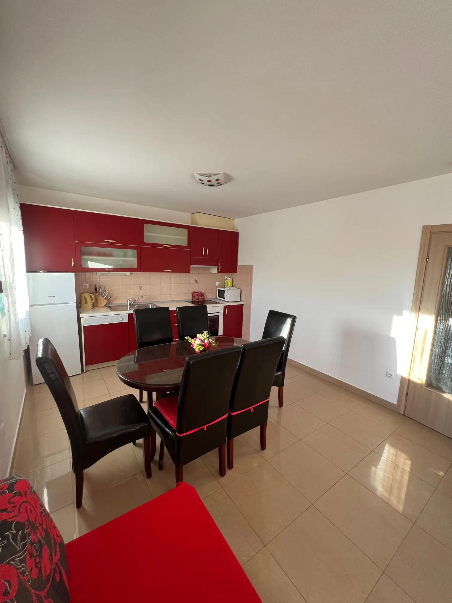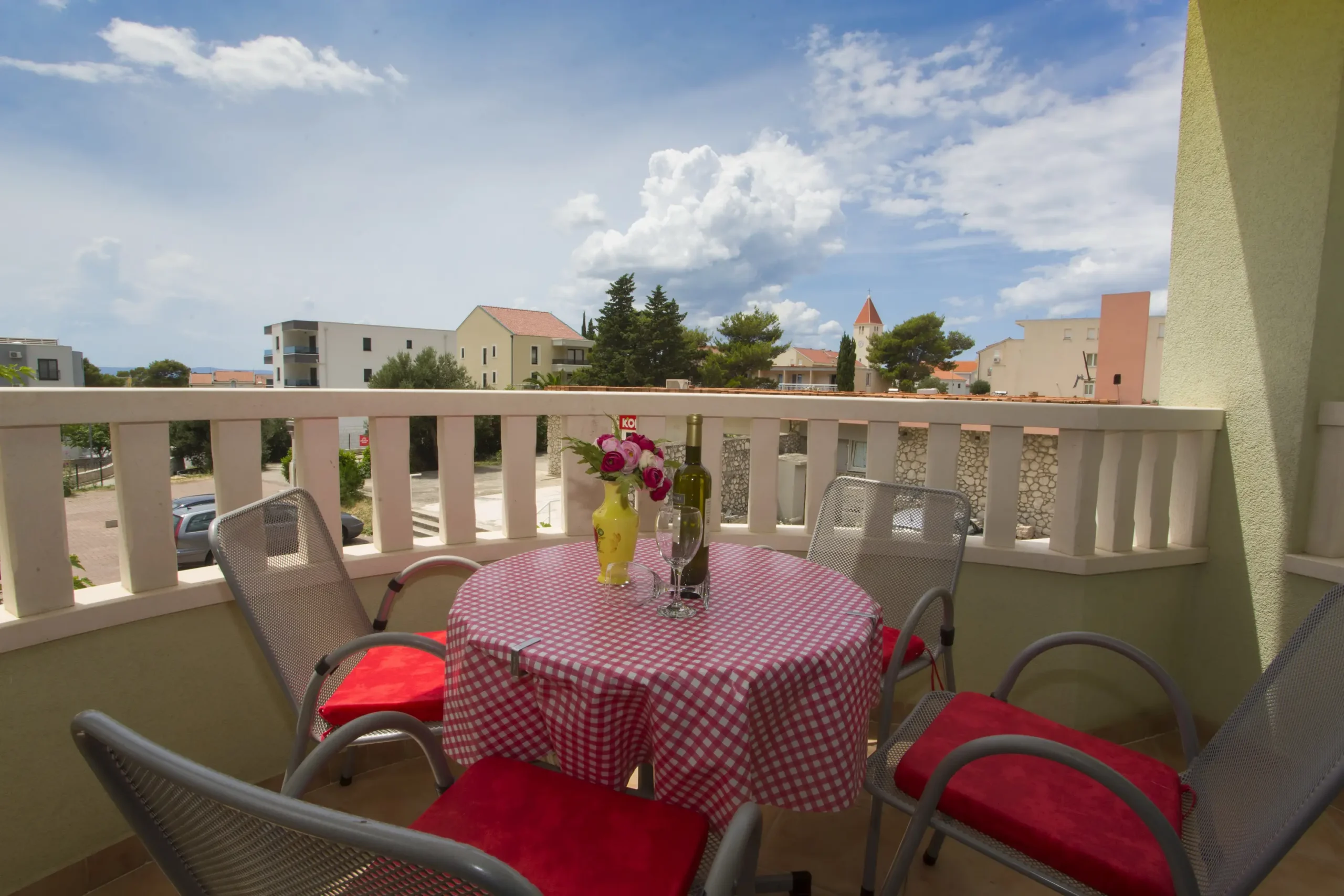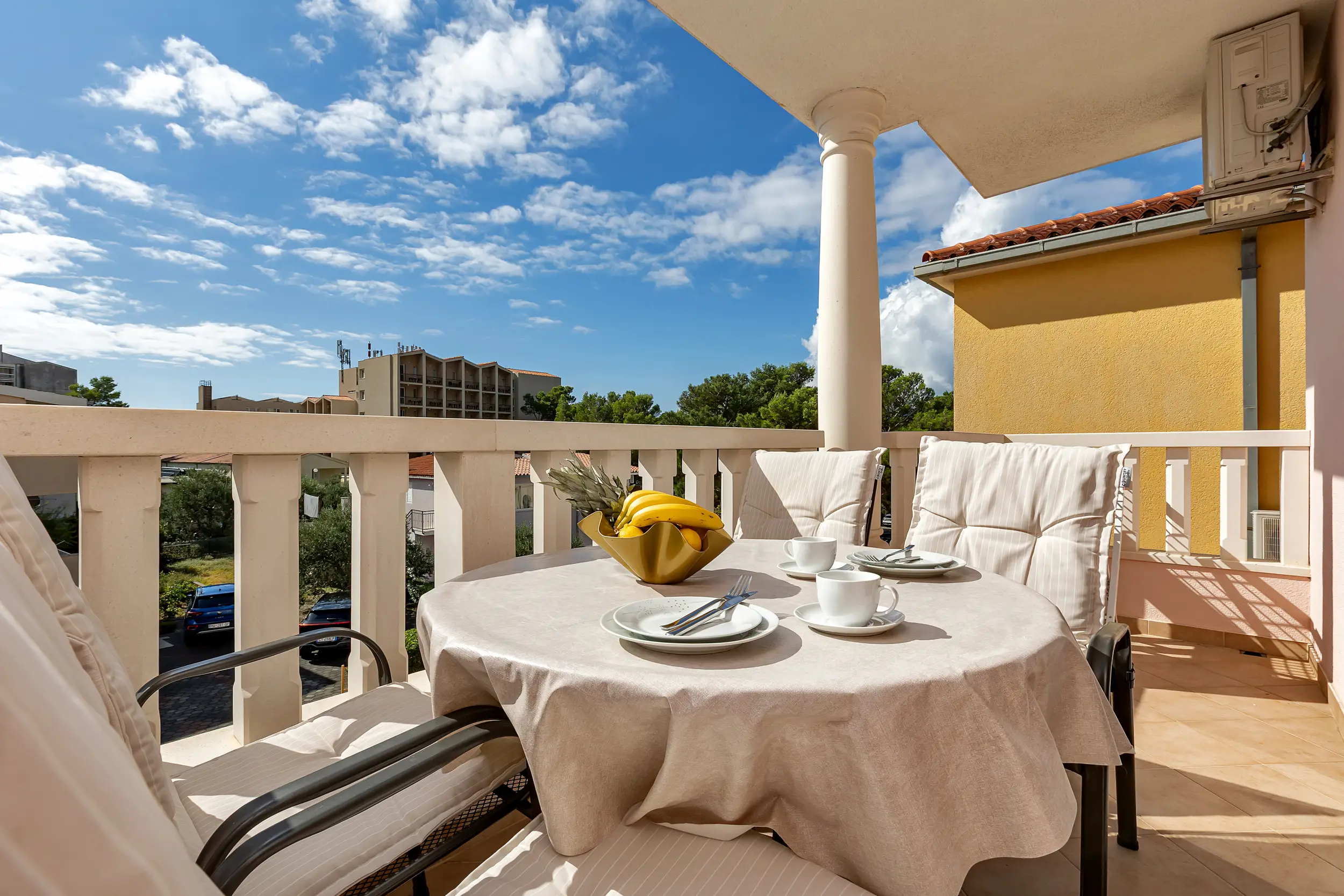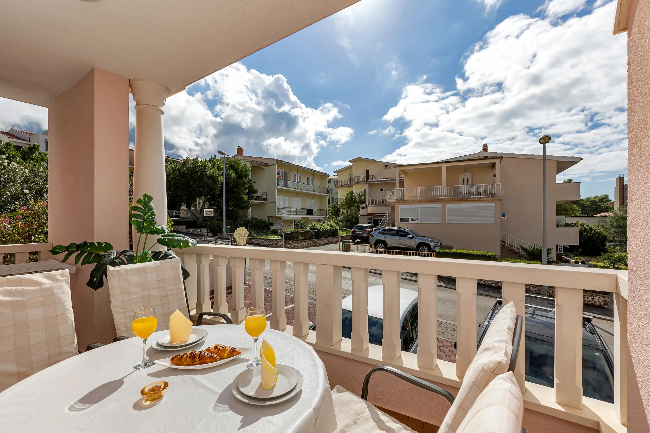 Iz dnevnog boravka izlazi se na prostrani balkon površine 9 m², idealan za opuštanje. Gostima su također dostupni bazen, roštilj u dvorištu objekta, fitness soba u podrumu te vlastita perilica rublja. Svaki apartman ima osigurano jedno parkirno mjesto, a nalazi se na samo 90 metara od poznate plaže Nikolina. Pogled na more. Roštilj i drveni vanjski stol i klupe, bazen, ležaljke i suncobrani.